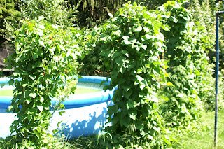Die Stangenbohnen sind enorm schnell gewachsen und schlingen schon fast alles zu. Sie stehen rund um unser Planschbecken und werden übrigens mit dem Wechselwasser bewässert. Es gibt sogar auch schon einige zarte Fisolen.