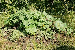 Die Kürbisse und Erdäpfel wachsen inzwischen schon recht munter.Erste haben viele Blüten und auch schon ein paar Früchte.