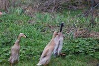 - Schnecken bekämpfen wir händisch durch absammeln und mit unseren gefiederten Freunden, sprich Enten und Hühner.