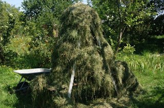 Gestern haben wir noch am späten Abend Heu zusammengerecht und da es schon so richtig herbstlich feuchtelt ein Heumandl mit einer Leiter und ein paar Latten improvisiert. Ich hoffe, das funktioniert so auf diese Weise.
