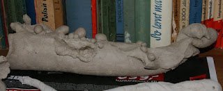 Das „Füllhorn“  wird, wenn es fertig gebrannt und glasiert ist, als Verzierung eines Blumenstabs in den Garten wandern.