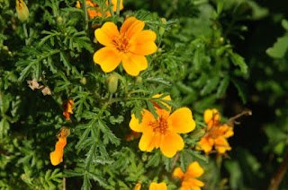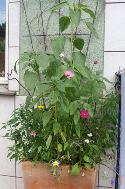 Zum Abschluss möchte ich dir noch meinen Wildblumentopf beim Hauseingang zeigen: Trichtermalven, Sonnenblumen, Fuchsien und Cosmeen, Färberkamille, Lein, Kornblumen und noch ein paar andere.