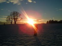 Ein kleiner Spaziergang zu viert am Nachmittag durch den Schnee. Die Kinder sind am Hügel mit dem Bob gefahren. Langsam ging die Sonnen unter und färbte die Landschaft mit ihrem sanften rotgoldenen Licht.